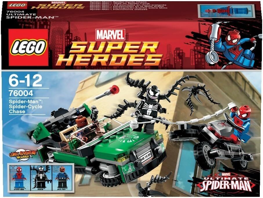 The product is a LEGO set featuring the Marvel character Spider-Man in the "Spider-Cycle Chase" theme. The set, number 76004, includes 237 pieces to build Spider-Man's Spider-Cycle. It also includes the LEGO characters Spider-Man and a Hero. The set is part of the Super Heroes LEGO subtheme and is recommended for ages 6-12. The dimensions of the built Spider-Cycle are approximately 2.4 inches in height, 10.3 inches in length, and 7.5 inches in width.